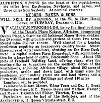 Dean’s Place was again advertised for sale in 1871[12] and 1878[13] By about 1882 William Reynold Gade (1833-1887) appears to be the owner of the property.[14] He was married to Isabelle Julie Daelman (1842-1921) and she inherited the house when he died. In 1893 she decided to sell the whole estate and a major sale was held. The property was subdivided into many lots and they were sold separately. The first sale was in June 1893 and was preceded by a sumptuous champagne luncheon.[15] Dean's Place was advertised again in December 1893 and bought by Charles Goble Champion (1854-1919),[16] a solicitor, who also owned property in Eastbourne. After his death the house was bought by General Sir Herbert Lawrence.