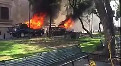 ![]() Two police cars set on fire in protest over the death of Giovanni López in Guadalajara. | |