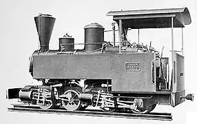 Steam locomotives of different types were used. One of the most interesting came from the artillery captain Péchot. This Fairlie locomotive and was specially designed for being used by the army. There were also Mallet locomotives that were used under the same conditions as the previous ones. The cars, which were used for passenger traffic, were of different designs, which resembled those of the Ministry of the Armed Forces.[3]