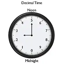 Decimal time is the representation of the time of day using units which are decimally related. This term is often used specifically to refer to the time system used in France for a few years beginning in 1792 during the French Revolution, which divided the day into 10 decimal hours, each decimal hour into 100 decimal minutes and each decimal minute into 100 decimal seconds (100000 decimal seconds per day), as opposed to the more familiar UTC time standard, which divides the day into 24 hours, each hour into 60 minutes and each minute into 60 seconds (86400 SI seconds per day).