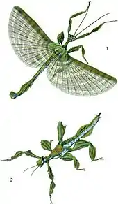 A fine large "Phasma" illustrated by George Robert Gray in 1833, showing cryptic resting pose and dramatic wing flash