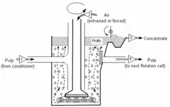 Froth flotation was adapted from the flotation process used in the mining industry in the 1960s. It is the most common deinking process in Europe used to recover recycled paper. Often most of the collector is added to the inlet of the flotation. The process temperatures are normally in the range 45 - 55 °C. Air is blown into the pulp suspension. The collector has affinity both to the ink particles and air bubbles, causing them to attach. The air bubbles lift the ink to the surface and form a thick froth that can be removed. Normally the setup is a two-stage system with 3, 4 or 5 flotation cells in series.[9] Flotation deinking is very effective in removing ink particles larger than about 10 µm.