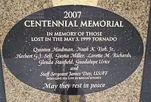 A memorial stands along a walking and bike path on Sooner Road and is dedicated to the seven people who lost their lives during the May 3 tornado.[31] United States Air Force Staff Sergeant James Day was killed in an ATV accident on May 8, 1999, while he was patrolling an area of Tinker AFB, Oklahoma, which had been damaged in the tornado. He is also listed on the memorial.[32]