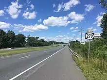 What is now DE 279 was originally an unimproved county road.[6] From the 1910s to the 1938, it was the westernmost part of Lincoln Highway, which ran from the Maryland state line through Newark east to Wilmington and Claymont.[6][7] By 1924, the road was paved.[8] In 1925, suggestions were made for the state to take over maintenance of the highway connecting the Maryland state line to Newark.[9][10] In 1927, the state took over maintenance of the highway between the Maryland state line and Newark.[11] When Delaware designated its state highways by 1936, the current alignment of DE 279 was designated as the westernmost part of DE 2, which ran from the Maryland state line through Newark and continued east to Wilmington.[12] The portion of DE 2 along Elkton Road between the Maryland state line and Newark was widened into a divided highway in 1972.[13] In 2013, DelDOT proposed the renumbering of routes in and around Newark, which involved truncating DE 2 from the Maryland state line to the eastern edge of Newark and the removal of DE 2 Bus. through downtown Newark. As a result of these changes, the portion of Elkton Road between the Maryland state line and the Christiana Parkway was to be designated as DE 279, matching the route number across the Maryland state line. The goal of the project was to "simplify the route designations in Newark, reduce sign clutter, and reduce sign maintenance costs." The changes were completed in the middle part of 2013.[2]