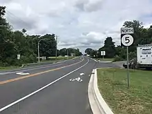 Delaware Route 5 Alternate (DE 5 Alt.) is a 3.8-mile-long (6.1 km) alternate route of DE 5 that bypasses the town of Milton. The route travels west from DE 5 south of Milton along two-lane undivided Sand Hill Road through areas of farms and woods with some homes. The route turns north to join DE 30 on Gravel Hill Road, crossing an abandoned railroad grade just east of the terminus of the Delmarva Central Railroad's Milton Industrial Track line. DE 5 Alt. splits from DE 30 by turning east onto DE 16, following that route through more rural areas on Milton Ellendale Highway. The route ends at an intersection with DE 5 north of Milton. In some locations, the route is signed as "DE 5 Truck Alt."[3][16] The section of the route concurrent with DE 16 is designated as part of the Delaware Bayshore Byway, a Delaware Byway and National Scenic Byway.[6][7]