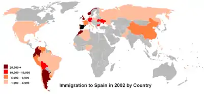 The arrival of migrating young adults was the main reason for the slight increase in Spain's fertility rate.[9] From 2002 through 2008 the Spanish population grew by 8%, of which 7% were foreign.[10]