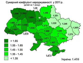 According to the 2021 interview with Ukrainian professor Iryna Kurylo[37] from M.V. Ptukha Institute for Demography and Social Studies, Ukraine's total fertility rate is 1.20 children per woman making it the lowest in Europe.[38]
