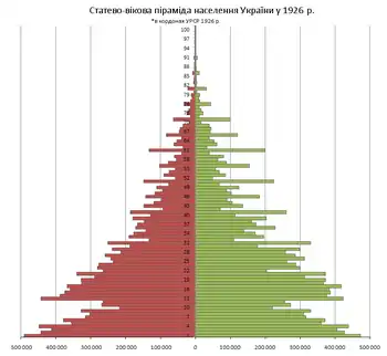 The famines of the 1930s, followed by the devastation of World War II, created a demographic disaster. Life expectancy at birth fell to a level as low as ten years for females and seven for males in 1933 and plateaued around 25 for females and 15 for males in the period 1941–44.[16] According to The Oxford companion to World War II, "Over 7 million inhabitants of Ukraine, more than one-sixth of the pre-war population, were killed during the Second World War."[17]