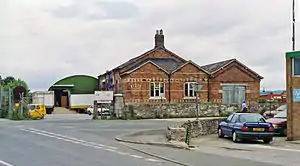 The Tudor Gothic-style station building, which incorporated accommodation on the first-floor for the station master, primarily used limestone, with detailing such as around the doors, windows and chimneys being of freestone. The booking and left luggage offices were placed centrally, and there were three waiting rooms - a general room, one for ladies travelling first-class and another for those ladies travelling second-class. There was an initially single platform, partly sheltered by a roof supported by cast iron columns. That platform was extended in 1885 and altered also to allow trains to stop regardless of their direction of travel.[3][2]