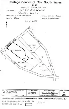 The site is much reduced (it was 78 hectares (190 acres) in 2000) from its original 202 hectares (500 acres) in 1810 and an additional 250 acres acquired by Brooks during the 1820s. The estate comprising 554 hectares (1,368 acres) was subdivided for sale in 1884 and 27 hectares (66 acres) were reserved around the house but this lot did not sell until 1890 when it was purchased with 81 hectares (200 acres) by the Mayne family, members of whom lived there until 1957. The immediate curtilage is protected and the surrounding area has been developed with 1 hectare lot (minimum) subdivision, compromising views from Denham Court, once extensive.[7][1]