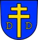 The coat of arms is a golden Lorraine cross with a golden letter D to the left and to right, all on a solid royal blue background.