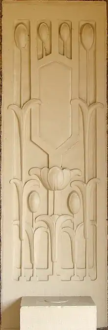 The Prairie style home was designed by Robert C. Spencer, a contemporary of Frank Lloyd Wright. He was known for blending the more modern Prairie style with historical elements, such as the half-timbering that is found on this house.[4] The tulip, which was Mrs. Hauberg's favorite flower, is featured stylistically throughout the exterior and interior of the structure. Spencer adapted the tulip to decorative elements such as stone insets, plaster molding, wood organ screens, fixtures and decorative tiles. Chicago landscape architect Jens Jensen laid out the 10-acre (4.0 ha) property to appear as a Wisconsin woodland. A winding path and stone bridge from Jensen's design remain on the west side of the house.[4]