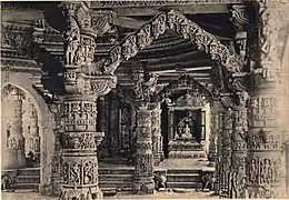 The brothel of Chandramukhi was the most expensive set among others, with ₹120 million (US$1.6 million) was spent;[2] The Times of India called it "the costliest set of made in the history of Hindi cinema",[42] while Alkokar said that it was "the most challenging job".[38] A multidimensional set with a temple city and an artificial lake around it, the construction was inspired by the Dilwara Temples located in Rajasthan. With the major color of festive gold, the set had 60 explicitly-carved domes and a 6-foot (1.8 m) chandelier.[2][42] For the song "Dola Re Dola", Desai (without Alkokar's help)[38] used twenty-five pieces of glass for the floor and added a layer to prevent actors from got injure when they dance on it.[41] The media estimated the total budget of the film's entire sets to be ₹200 million (US$2.6 million),[2] and reported that it took nearly nine months to build them.[42] Desai recalled the experiment as "a beautiful challenge, as a classic masterpiece had to be recreated with precision and opulence".[37]