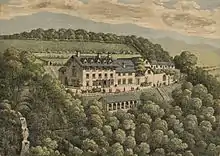 Devil's Bridge has been a tourist attraction for centuries. Records indicate that tourists were coming to this area by the mid 1700s and that an inn or hotel has existed nearby since before 1796. The area was once part of the Hafod Estate, owned by Thomas Johnes who built a small hunting lodge on the estate which was eventually expanded into an inn. The building burned down and was rebuilt.[13] Significant renovations were completed in 1837–1839 and in the 1860s. After several expansions and upgrades, it has been operated as the Hafod Hotel, using this name since the 1860s. In 2017, new owners had arranged for a survey in preparation for a major renovation; they intended to maintain much of the historical character of the building.[14][15] Some interior renovation work had been completed by September 2017.[16]