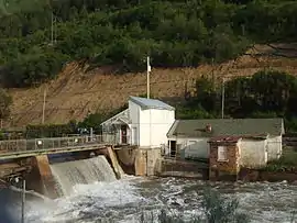 Water is fed to the powerplant from a low dam about 1.75 miles (2.82 km) upstream. Overflow is controlled by two tainter gates between concrete piers. A 3-foot (0.91 m) wide fish ladder climbs the north side of the dam. On the south side a large sluice gate allows the small reservoir to be drained. The intake structure is between the sluice gate and the south buttress wall, housed in a small wood frame intake house. A one-story wood-frame watchman's house is just downstream from the intake house, and is joined to the intake house. The power plant intake conduit is a 74-inch (1.9 m) diameter reinforced concrete pipe for the first 125 feet (38 m), transitioning to a welded steel pipe. This replaced 2,000 feet (610 m) of concrete pipe and 7,075 feet (2,156 m) of wood stave pipe in 1949. The conduit is buried along most of its length. It crosses the river on a 99-foot (30 m)-span riveted steel Howe truss bridge made by the American Bridge Company downstream from the dam. Total head is about 120 feet (37 m) to 140 feet (43 m). Since the conduit has been altered and is partly buried under the rail line it is not included in the historic district designation.[2]
