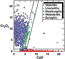 Mineral inclusions, especially the silicate inclusions in lithospheric diamonds, can be classified into two dominant types depending on the mantle parental rocks of the host diamond: eclogite (E-type) and peridotite (P-type). These are the two main parental rocks for the diamond formation which mostly lead to silicate inclusions.[1][4] P-type and E-type inclusions can be distinguished based on the content of specific materials in the trapped mineral. For instance, in garnet inclusions, the content ratio of chromium(III) oxide (Cr2O3) and calcium oxide (CaO) can be the basis for the classification.[5] E-type garnet inclusion contains less Cr2O3 while P-type contains less CaO. Trace elements such as rare earth elements (REE) can also characterize P-type and E-type garnet inclusions.[6] Similarly, nitrogen inclusions can be classified into P-type and E-type inclusions by analyzing their stable isotopes.[7] For sulfide inclusions, osmium contents from rhenium-osmium dating can differentiate P-type and E-type inclusions.[8]