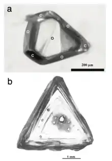 The timing of mineral crystallization can be used to categorize diamond inclusions into three types: protogenetic, syngenetic, and epigenetic inclusions.[15] Minerals in the protogenetic inclusions were crystallized earlier than the diamond formation. The host diamond encapsulated pre-existing minerals during its crystallization. Therefore, protogenetic inclusions provide information on the conditions that existed before diamond formation. This can explain isotopically different mineral inclusions found from the same generation of diamonds.[16] For syngenetic mineral inclusions, the crystallization of the trapped mineral and the diamond occur simultaneously.[1] In this case, the environmental records from included minerals match that of the host diamond. Syngenetic inclusions can be evidenced by the imposition of host diamond morphology on the trapped mineral.[17] Epigenetic inclusions are formed from minerals that crystallized after the diamond formation. The after-formed minerals can crystallize along diamond fractures or the pre-existing protogenetic/syngenetic inclusions may have been altered into new material.[1]