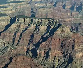 The forested top of Diana Temple is composed of Permian Kaibab Limestone overlaying cream-colored, cliff-forming, Permian Coconino Sandstone.[7] The sandstone, which is the third-youngest of the strata in the Grand Canyon, was deposited 265 million years ago as sand dunes. Below the Coconino Sandstone is reddish, slope-forming, Permian Hermit Formation, which in turn overlays the Pennsylvanian-Permian Supai Group.[8] Further down are strata of the conspicuous cliff-forming Mississippian Redwall Limestone, the Cambrian Tonto Group, and finally granite of the Paleoproterozoic Vishnu Basement Rocks at river level in Granite Gorge. Precipitation runoff from Diana Temple drains east to the Colorado River via Slate Creek on the north side of the mesa, and Topaz Canyon on the south side.