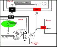 Glutamate transporters are proficient at pumping glutamate into cells due to their ability to couple with inorganic ions.[4] Transport of glutamate into the cell requires the coupling of three sodium ions as well as a proton, whereas transport out of the cell requires a single potassium ion.[4] This transport results in two positive charges being displaced across the membrane per cycle.[4] Moreover, this process is dependent on a pH gradient, due to glutamate needing to be protonated prior to transport.[4]