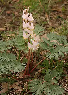 Dicentra (Greek dís "twice", kéntron "spur"),[3] known as bleeding-hearts, is a genus of eight species of herbaceous plants with oddly shaped flowers and finely divided leaves, native to eastern Asia and North America.