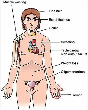 | Symptoms | Enlarged thyroid, irritability, muscle weakness, sleeping problems, fast heartbeat, weight loss, poor tolerance of heat[1] |