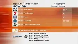 Digital terrestrial television brought a number of enhancements over the previous analogue television, primarily higher-quality picture and sound, as well as datacasting and multi-view services such as video program guides, high definition, and now-and-next program information. There are a number of additional channels, datacasting, as well as high definition services, available to digital terrestrial television viewers in Australia. Digital-only content is subject to availability and differs greatly in various television markets.