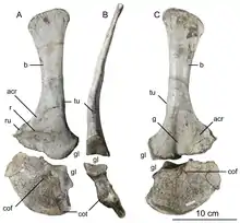 The scapulae (shoulder blades) were moderate in length and concave on their inner sides to follow the body's curvature. The scapulae were wide, particularly the upper part, which was rectangular (or squared off), a unique feature. The coracoids were elliptical, and not fused to the scapulae. The lower hind portions of the coracoids had a "horizontal buttress" next to the biceps tuber, unique for this genus. The arms were powerful, and had deep pits and stout processes for attachment of muscles and ligaments. The humerus (upper arm bone) was large and slender, and the ulna (lower arm bone) was stout and straight, with a stout olecranon. The hands had four fingers: the first was shorter but stronger than the following two fingers, with a large claw, and the two following fingers were longer and slenderer, with smaller claws. The claws were curved and sharp. The third finger was reduced, and the fourth was vestigial (retained, but without function).[2][31][6]