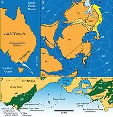 The remains of Diluvicursor were discovered in 2005 in the Eumeralla Formation, dating from the early Albian, in Victoria, southeastern Australia at the beach of Cape Otway near the extensively excavated Dinosaur Cove, a location where the remains of several other ornithischians had been previously discovered, alongside remains of other species. The then new locality was named the "Eric the Red West Sandstone" (ETRW). The find was reported in the scientific literature by Thomas Rich et al., in 2009, in a study about remains from ETRW referred to the mammal Bishops. The authors tentatively it referred to Ornithopoda. The vertebra of a spinosaurid, NMV P221081, was also found at the site. In a 2013 review of ornithopods from Victoria, it was given a diagnosis and preliminary description.[1][2][3]