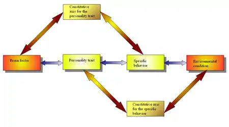 Hans Eysenck's three factor model of personality contains the independent dimensions of extraversion, neuroticism, and psychoticism; these different dimensions are caused by the properties of the brain, which themselves are the result of genetic factors.[18]