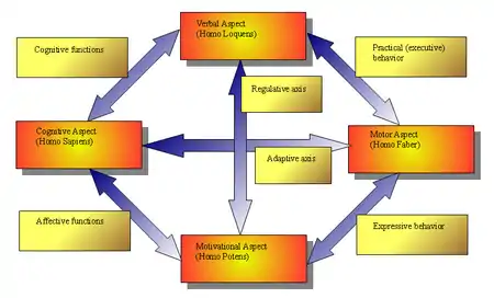 The work on subpersonalities[2] was integrated into a hypostatic model.[3] The model describes personality aspects and dimensions, as well as intra- and interpersonal relations. Not the person whole and alone, nor the relationship, but the relation between parts of person(s) is held as a central element that promotes both personal and social organization and disorganization. Personality is viewed as both an agency and a construction, along with its development and psychopathology, as the model is accompanied by specific methods of assessment and therapy, addressing each of the personality dimensions. The hypostatic relations of the human mind also imply the existence of a hypostatic model of consciousness, representing the contents of consciousness as an identity of various aspects, different only with respect to each other, but tending to coincide in a certain aspect of their consideration.[4]