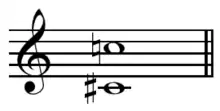 In music from Western culture, a diminished octave ( Play ) is an interval produced by narrowing a perfect octave by a chromatic semitone.[1] As such, the two notes are denoted by the same letter but have different accidentals. For instance, the interval from C4 to C5 is a perfect octave, twelve semitones wide, and both the intervals from C♯4 to C5 and from C4 to C♭5 are diminished octaves, spanning eleven semitones. Being diminished, it is considered a dissonant interval.[3]