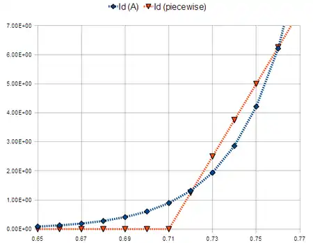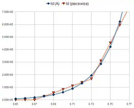 When more accuracy is desired in modelling the diode's turn-on characteristic, the model can be enhanced by doubling-up the standard PWL-model. This model uses two piecewise-linear diodes in parallel, as a way to model a single diode more accurately.