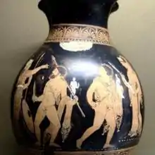 When the sacrifice of Iphigenia (Agamemnon's daughter) became a necessity for the Achaeans to sail away from Aulis, King Agamemnon had to choose between sacrificing his daughter and resigning from his post of high commander among Achaeans. When he decided to sacrifice his daughter to Artemis, Odysseus carried out this order of Agamemnon by luring Iphigenia from Mycenae to Aulis, where murder, disguised as wedding, awaited her.[8] According to Hyginus, Diomedes went with Odysseus to fetch Iphigenia, making this the two companions' first mission together.[9] However, Pseudo-Apollodorus has Agamemnon send Odysseus and Talthybius instead.[10] According to Euripides, neither of the two went to fetch Iphigenia, though he calls the plan Odysseus' idea in Iphigenia at Taurus.[11]