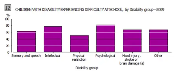 In South Korea, disabled people are divided into six levels.[8] Index 1 indicates the most severe degree of disability, and index 6 indicates less serious. In this grading, people without disabilities mean no disability; mild disability means that the disability severity index is between 3 and 6; severely disabled means that the disability severity index is 1 or 2. Mild disability includes people who can take care of themselves, even if some of them require personal support. Severe disabilities include those who are highly dependent on personal assistance or assistive devices.[9] The reason for dividing people with disabilities into serious and minor is that not only do they have different medical needs, but also some benefits are determined by this definition of severity.[10]
