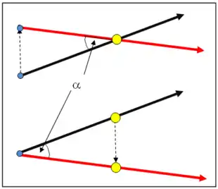 Parallax is a displacement or difference in the apparent position of an object viewed along two different lines of sight, and is measured by the angle or semi-angle of inclination between those two lines.[1][2] Due to foreshortening, nearby objects show a larger parallax than farther objects when observed from different positions, so parallax can be used to determine distances.