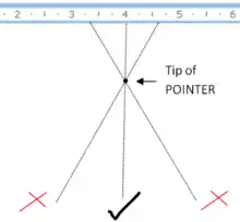 Measurements made by viewing the position of some marker relative to something to be measured are subject to parallax error if the marker is some distance away from the object of measurement and not viewed from the correct position. For example, if measuring the distance between two ticks on a line with a ruler marked on its top surface, the thickness of the ruler will separate its markings from the ticks. If viewed from a position not exactly perpendicular to the ruler, the apparent position will shift and the reading will be less accurate than the ruler is capable of.