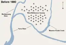Before the foundation of Melbourne, Docklands was a wetlands area consisting of a large salt lake and a giant swamp (known as West Melbourne Swamp) at the mouth of the Moonee Ponds Creek. It was one of the open hunting grounds of the Wurundjeri people, who created middens around the edges of the lake.
