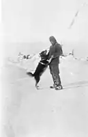 The timing for the start of the sledging journey was unfortunate: all the bitches were on the point of giving birth.[34] On 17 November, just after the three sledging parties separated, Gadget was killed because she had proved a poor puller and was judged to be tired out from carrying her pups. She was "cut up into about 24 rations counting 7 pups"[35] to be fed to the other dogs, but they did not seem to enjoy eating her.[36] Fusilier and Jappy followed soon afterwards; Jappy was fed to the other dogs along with the pups of Ginger Bitch. Betli disappeared on 27 November when the dogs were let off. Blizzard was injured by Mertz on skis on 18 December and had to be shot on 28 November.[24]