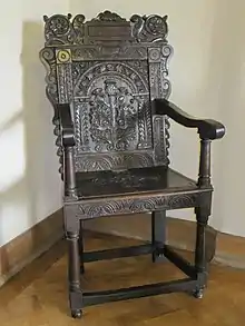 There were several kinds of beds. A richly carved bed at Crathes Castle with Burnett family monograms is one of the few surviving 16th-century Scottish beds, attributed to an Aberdeen school of carving. There is also a set of two chairs at Crathes, for the laird Alexander Burnet and one for his wife Katherine Gordon, hers with Gordon heraldry and dated 1597.[20] In April 1581 James VI had a "stand bed" made of walnut timber and painted, with an oak dining table. These stand beds were free-standing wooden structures with posts.[21]