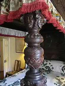 A carved walnut bed from Dunfermline Palace, thought to have belonged to Anne of Denmark, was transferred to an inn in the town, and was later dismantled to embellish a fireplace at nearby Broomhall House.[46] In 1760 the antiquarian Richard Pococke saw this bed at the inn and described it, seeing in the carvings of caryatid figures of a men and women emblems of fidelity and benevolence. The innkeeper, Mrs Walker, told him the bed had been sent from Denmark, that it was the royal marriage bed, and that Charles I was born in it.[47] At the time of the birth of Charles I, a different fabric-hung bed was made for the queen at Dunfermline Palace, described as a "chapel bed". It had green velvet curtains lined with Spanish taffeta. Four embroiderers decorated the bed with gold and silver trim and green silk latchets. During their work they were accommodated in two beds at the palace.[48]