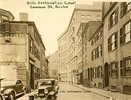 The Salesians moved into the Brandeis Vocational School Campus, the main building of which was formerly the City of Boston Continuation School, with the two sides of the building split into Boys' and Girls' Units, in time for the 1954 school year.[1][3] During this time there was a Salesian seminary program at Don Bosco Tech, which was terminated in later years. The original brick/limestone building was built in the 1920s.[4] This was plenty of space to house the student body of 200 plus Salesian quarters.[1] In the years following the student population rose rapidly, reaching 562 in 1966.[5]