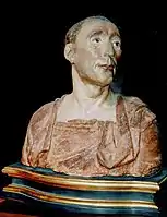 Some have perceived the David as having homoerotic qualities and have argued that this reflected the artist's own orientation.[7] The historian Paul Strathern makes the claim that Donatello made no secret of his homosexuality, and that his behaviour was tolerated by his friends.[8] The main evidence comes from anecdotes by Angelo Poliziano in his "Detti piacevoli", where he writes about Donatello surrounding himself with "handsome assistants" and chasing in search of one that had fled his workshop.[9] This may not be surprising in the context of attitudes prevailing in the 15th- and 16th-century Florentine republic. However, little detail is known with certainty about his private life, and no mention of his sexuality has been found in the Florentine archives (in terms of denunciations)[10] albeit which during this period are incomplete.[11]