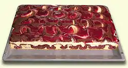 The batter is a pound cake, a cake made of equal amounts by weight of butter, flour, eggs and sugar, which is then divided into two parts, one of which is colored with cocoa. The two batters are spread in layers onto the baking sheet, the chocolate batter above the plain batter, before the top is strewn with sour cherries. During baking, the cherries sink to the bottom of the cake, causing the wavy pattern. After the cake has cooled it is decorated with a thick layer of buttercream and iced with a chocolate glaze which may then be ornamented in a wavy manner with a fork.