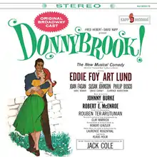 Donnybrook! opened on Broadway at the 46th Street Theatre on May 18, 1961 and closed on July 15, 1961 after 68 performances and 2 previews. The director and choreographer was Jack Cole, with sets and costumes by Rouben Ter-Arutunian. The cast featured Art Lund (as John Enright), Joan Fagan (as Ellen Roe Danaher), Eddie Foy Jr., Susan Johnson (as Kathy Carey) and Philip Bosco (Will Danaher).[1] The original actress for the role of Ellen, Kipp Hamilton, quit prior to opening due to a "respiratory ailment." Fagan was the stand-by for the role.[2]