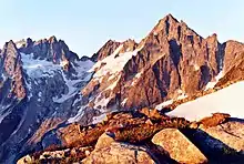 Dorado Needle[3] is an 8,440+ ft (2,570+ m) mountain summit located in North Cascades National Park in Skagit County of Washington state. The peak lies 0.73 miles north of Eldorado Peak and 1.33 mi (2.14 km) southeast of Perdition Peak.[1] It can be seen from the North Cascades Highway west of Marblemount at a road pullout along the Skagit River. The first ascent of the peak was made in July 1940 by Lloyd Anderson, Karl Boyer, and Tom Gorton via the Northwest Ridge.[4] Precipitation runoff and glacier meltwater from the mountain drains into tributaries of the Skagit River.
