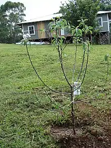 'Dorsett Golden' is a 'Golden Delicious'-like cultivar of domesticated apple and is descended from it, but is different with that it is early season, and most importantly, it needs a lower amount of cold weather (less than 300 hours) to go into blooming, so it is possible to grow in warm climates.[2]