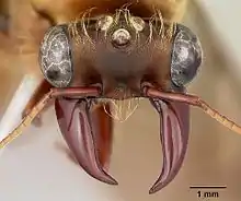 The diagnostic features of the D. gribodoi male are its mandible shape (the anterior quarter notably flexed inward) and the nearly flat posterior head margin. In the original description Emery compared D. gribodoi with D. atratus and stated that D. atratus was darker than D. gribodoi and that its scape was longer than half the length of the funiculus. Both Smith (1859) in the original description and later Santschi (1914) mentioned that the posterior head margin of the D. atratus male was convex. While the colouration of D. gribodoi is variable, it is not uniformly black in any of the specimens examined by us and the head shape is nearly rectangular with a flat posterior margin. Workers of D. gribodoi are unique (and easily identifiable) among all Dorylus species in having a nearly round petiole in dorsal view and a distinct ridge on the posterior head margin that is laterally developed into tiny horns in larger specimens. D. gribodoi workers of the same size class can be separated from workers of the D. kohli / D. congolensis complex also by the posterior margin of the head being angular in lateral view and not smoothly rounded.[7]