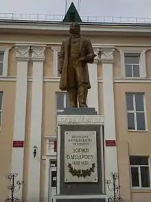 A statue of him was installed in June 2010 in Dzhidinsky District to celebrate the 75th anniversary of the founding of the district. The sculptor was the Buryat G. G. Vasilyev.[13] There is also a statue of him in Ulan-Ude, and a memorial to him at the Kazan University, installed in October 2020.[14]