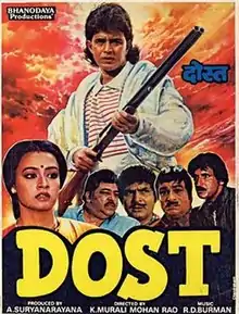 Dost (transl. Friend) is a 1989 Hindi film directed by K Murali Mohan Rao and produced by A. Suryanarayana under Bhanodaya Productions banner. Mithun Chakraborty and Amala play the lead pair of this family drama with Amjad Khan, Kiran Kumar, Asrani, Sujit Kumar, Shobha Khote, Sharat Saxena, Vikas Anand, Kader Khan, Dalip Tahil, Annu Kapoor and Bob Christo in the support cast. The lyrics were written by Indeevar with music composed by Rahul Dev Burman.