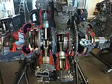 First run in 1937,[1] near the time that the larger 3,347.9 cu in (54.862 L) competing 18-cylinder Wright Duplex-Cyclone's development had been started in May of that year, the 2,804.5 cu in (45.958 L) displacement R-2800 was first-flown by 1940, one year before the Duplex-Cyclone. The Double Wasp was more powerful than the world's only other modern 18-cylinder engine, the Gnome-Rhône 18L of 3,442 cu in (56.40 L).[nb 1] The Double Wasp was much smaller in displacement than either of the other 18-cylinder designs, and heat dissipation was a greater problem. To enable more efficient cooling, the usual practice of casting or forging the cylinder head cooling fins that had been effective enough for other engine designs was discarded, and instead, much thinner and closer-pitched cooling fins were machined from the solid metal of the cylinder-head forging. The fins were all cut at the same time by a gang of milling saws, automatically guided as it fed across the head in such a way that the bottom of the grooves rose and fell to make the roots of the fins follow the contour of the head, with the elaborate process substantially increasing the surface area of the fins.[4] The twin distributors[5] on the Double Wasp were prominently mounted on the upper surface of the forward gear reduction housing - with one of the pair of magnetos mounted between them on most models - and almost always prominently visible within a cowling, with the conduits for the spark plug wires emerging from the distributors' cases either directly forward or directly behind them, or on the later C-series R-2800s with the two-piece gear reduction housings, on the "outboard" sides of the distributor casings.[6]